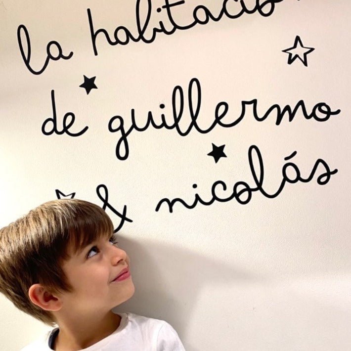 Con el vinilo de pared adhesivo personalizado con la frase “La habitación de…” podrás decorar y dar personalidad a cualquier rincón de la habitación de tu peque, dándole al cuarto ese aire nórdico que tanto nos gusta. Puedes poner uno o dos nombres si comparten o no habitación, sirve tanto para puertas como para paredes.